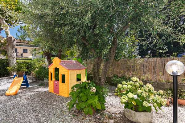 Nei mesi estivi, il patio esterno offre un ambiente fresco e ombreggiato, con ombrelloni, sedie e spazi dedicati al relax, dove gli ospiti possono godersi la brezza marina e ritagliarsi momenti di pace lontano dal caldo e dalla confusione.